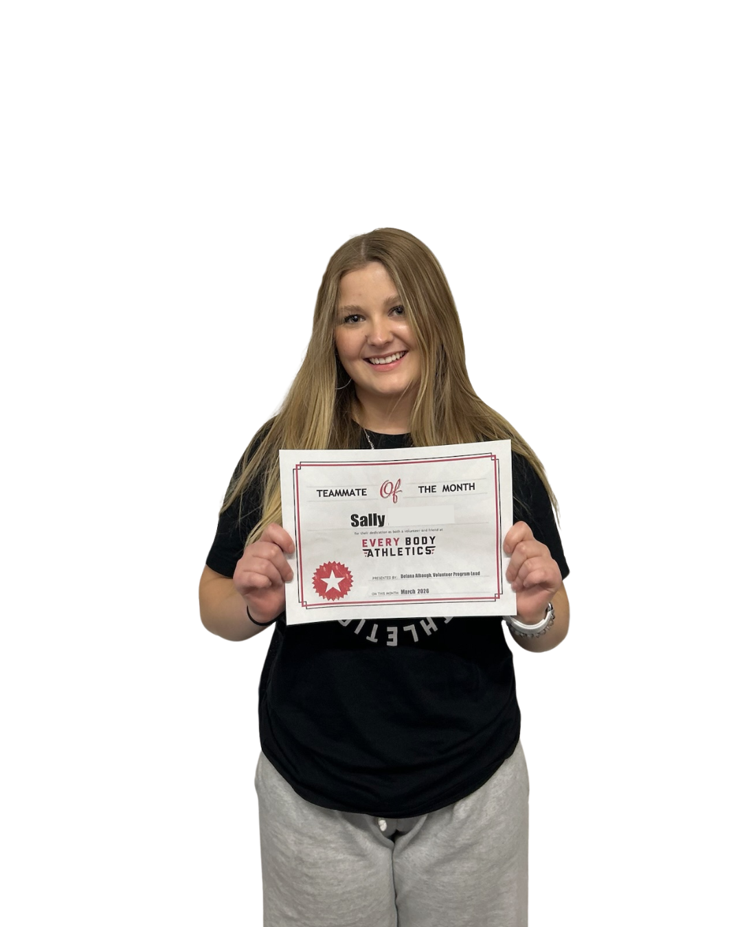 Congratulations to our March Teammate of the Month: Sally! Sally is a one of a kind person who lights up every room she is in! Every athlete is thrilled when they get to be partners with her in class. She is known for having the best dance moves and never saying no to a mid class dance break (also can do the worm?!). Sally demonstrates unconditional support and gentleness so well. She is a friend to all in class and we are so thankful for her!